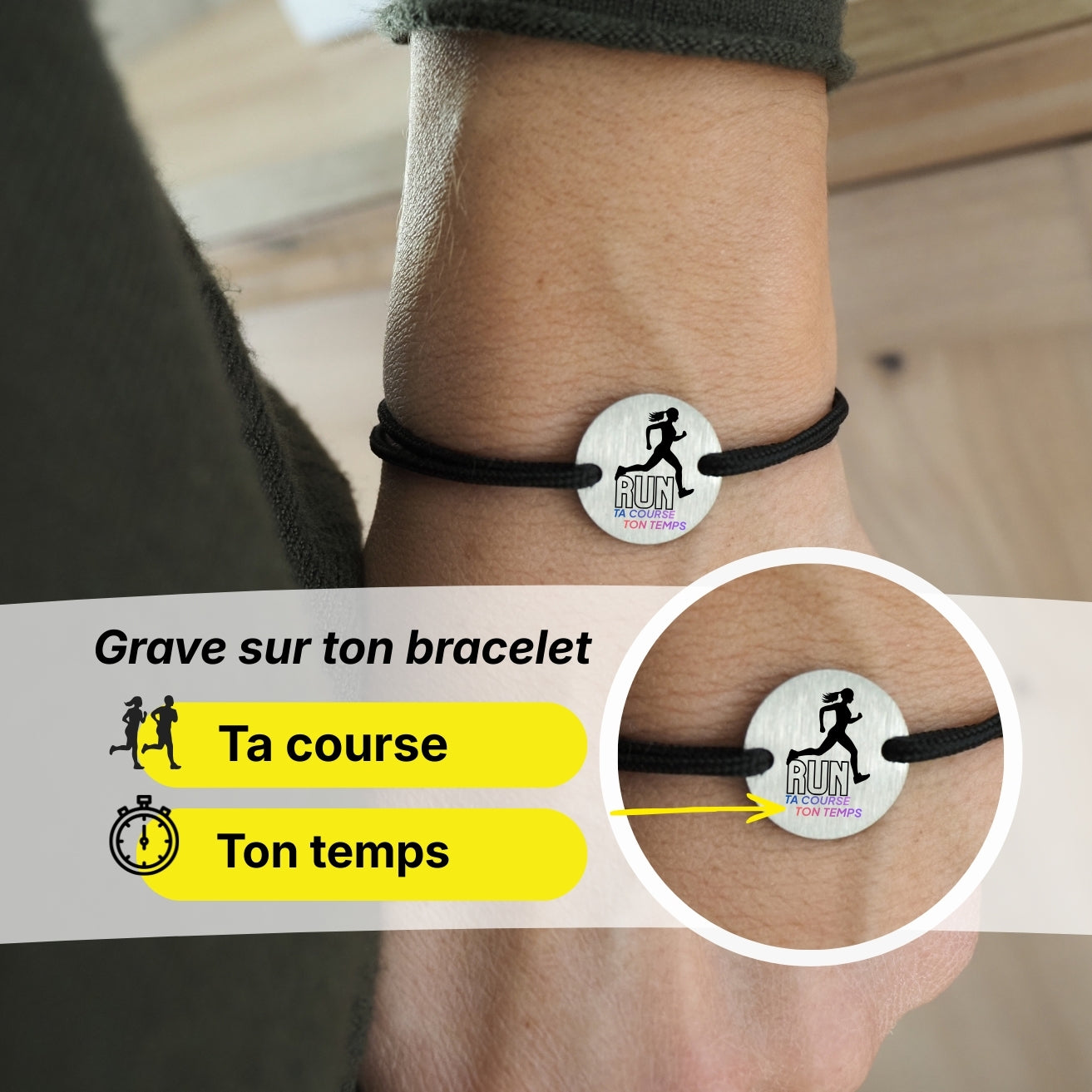 Nom de la course, temps, date ou message : chaque bracelet est gravé spécialement pour vous.