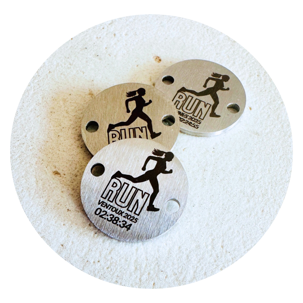 Vous pouvez personnaliser le pendentif (diamètre 16mm) avec le nom de la ville, l'année et votre temps afin d’immortaliser votre performance.